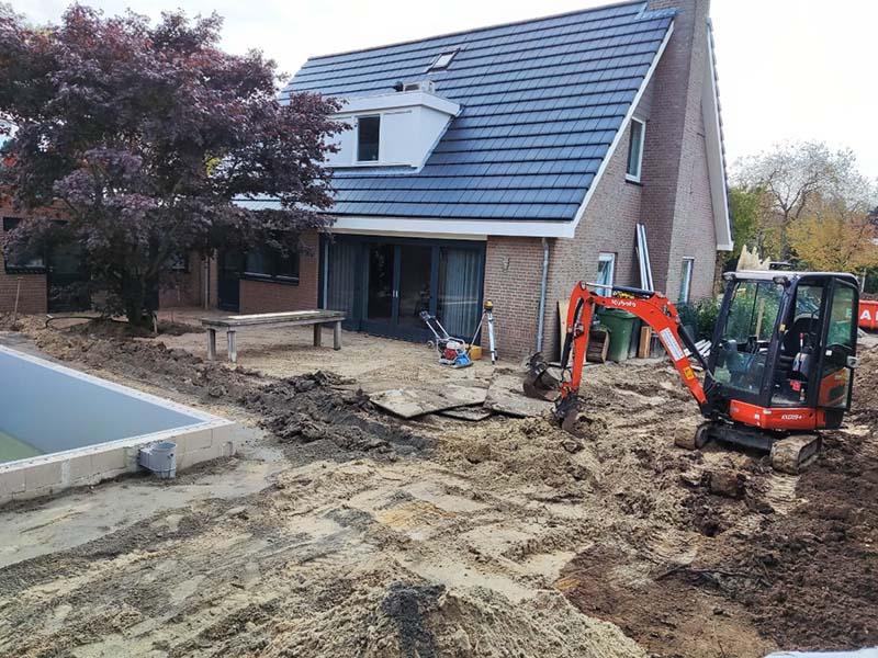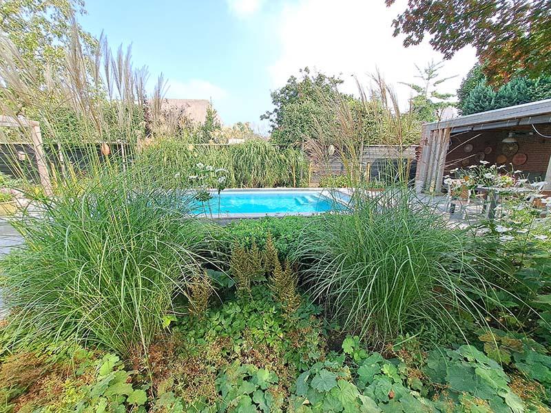 Een van de wensen van de bewoners was om twee terrassen te creëren: een plek om heerlijk in de zon te zitten en een schaduwrijke plek om te ontspannen. Bersselaar Groen plaatste daarom een eiken pergola die naadloos aansluit op de bestaande eiken overkapping. Dit zorgt voor een sfeervol terras waar de bewoners in alle rust kunnen genieten van de zon. Daarnaast is er goed gekeken naar de beste positie voor het zwembad. Dit werd zo geplaatst dat het optimaal toegankelijk is vanuit de woning en tegelijkertijd perfect past binnen het ontwerp van de tuin.