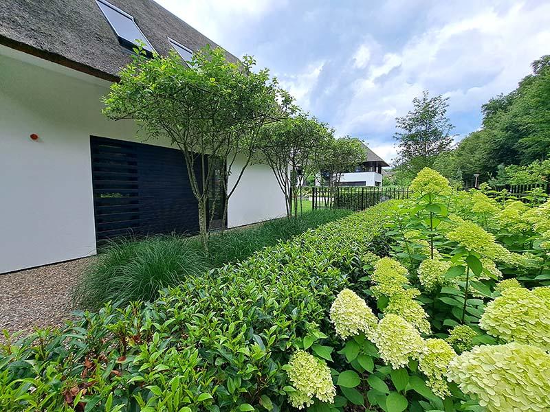 De voortuin wordt omlijst door een Portugese laurierhaag, die niet alleen privacy biedt, maar ook een gevoel van geborgenheid creëert. Als je verder kijkt, zullen de pluimhortensia’s je aandacht trekken en een vleugje landelijke charme toevoegen aan de voortuin.
