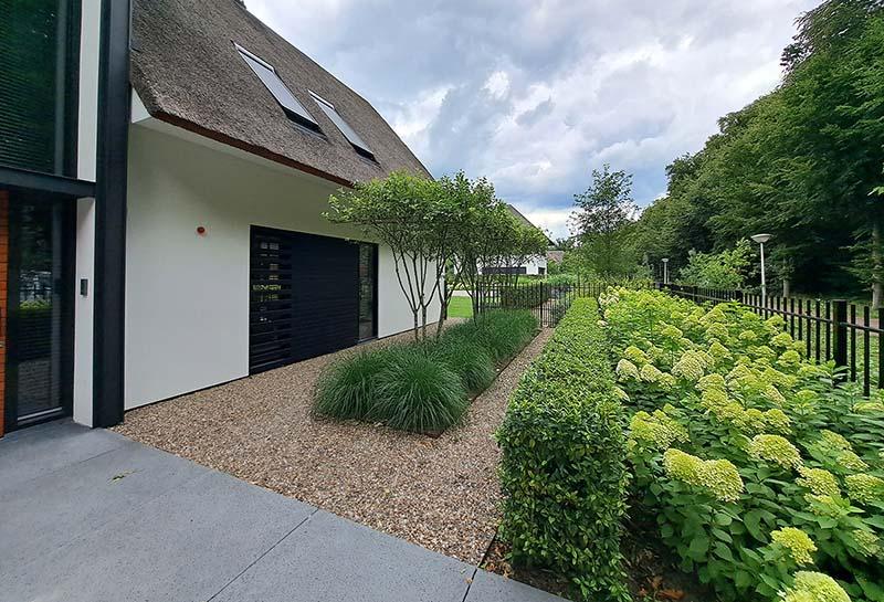 In de voortuin is veel aandacht voor detail besteed. Zo is het grind netjes ingebed in een grindmat, waardoor het altijd op zijn plaats blijft liggen en er strak en modern uitziet. Ook een opvallend detail zijn de Cortenstaal plinten die zijn geplaatst naast de tegels en tussen de border en grindvlakken. Zij zorgen voor een nette afscheiding van de verschillende zones van de voortuin en voorkomen dan grindsteentjes op ongegewenste plekken belanden.