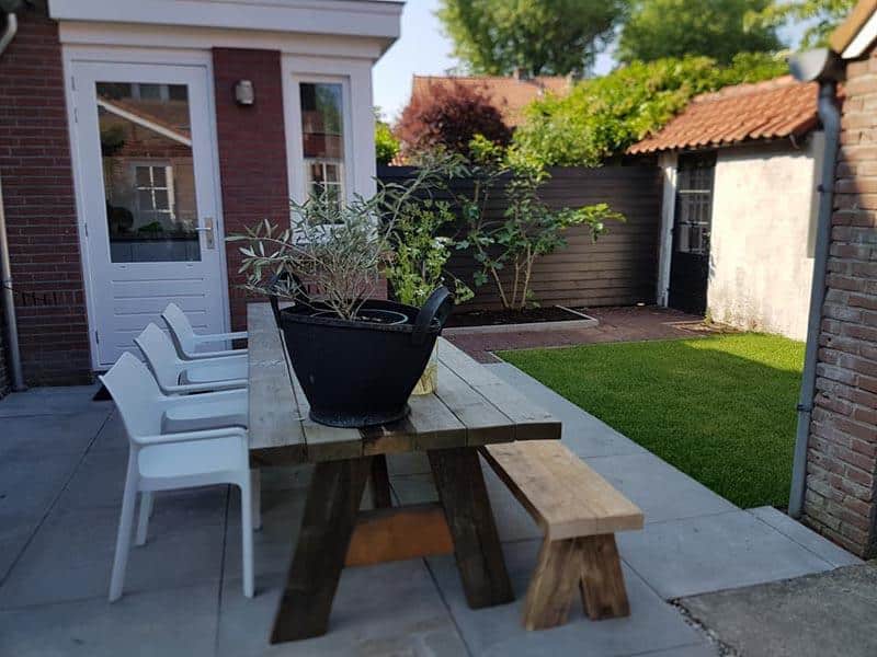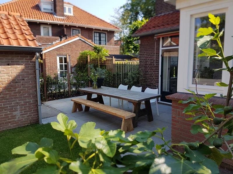 Achterin de tuin is een tweede zitplaats gecreëerd. Met een ondergrond van parelgrind en een splinternieuwe loungebank is ook dit gedeelte van de tuin helemaal naar wens. Deze hoek is niet helemaal vernieuwd, de prachtige vijgenbomen die er voor de verbouwing al stonden hebben we kunnen behouden. Deze bomen passen nog steeds mooi binnen het ontwerp en brengen een vertrouwde en eigen sfeer mee.