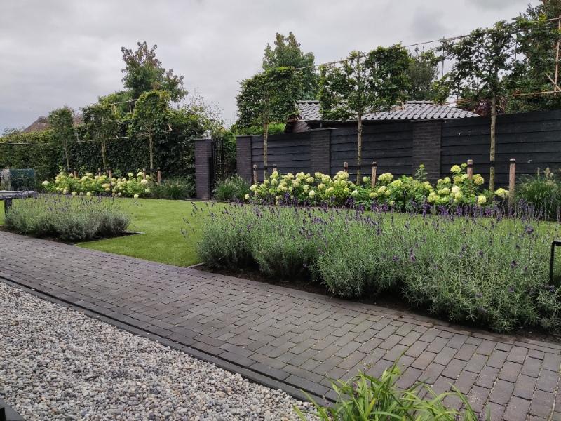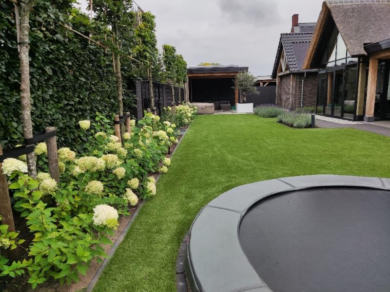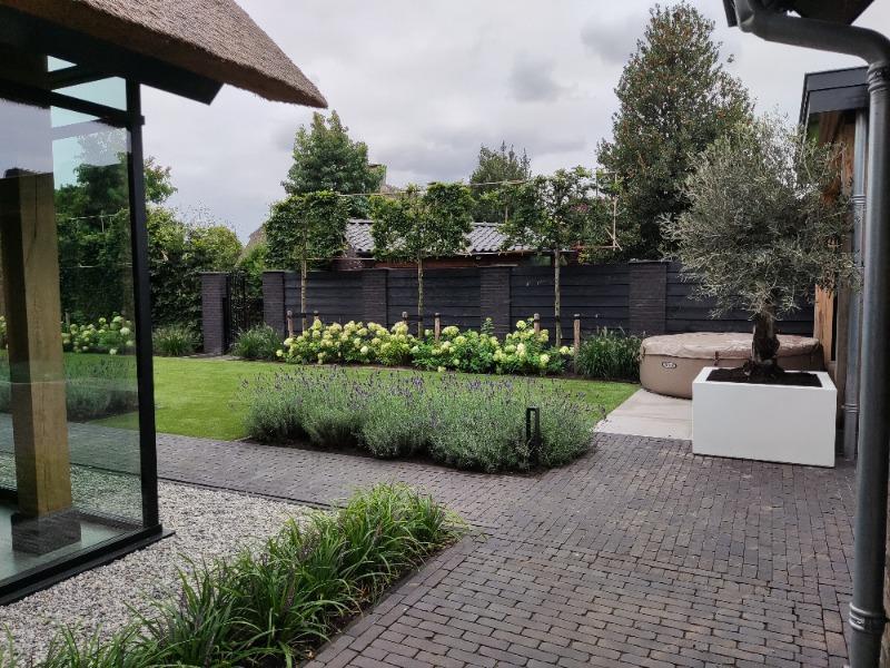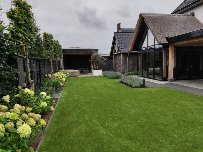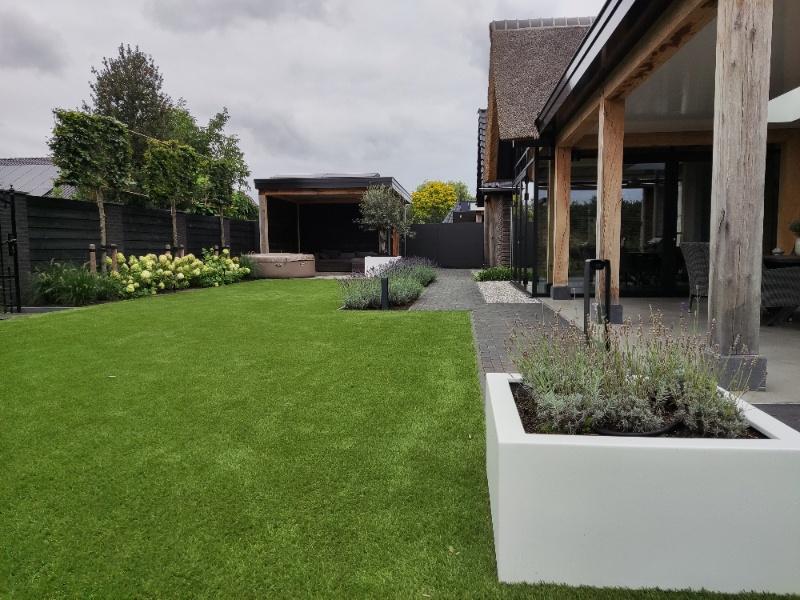 Comfort was een belangrijk uitgangspunt in het ontwerp van deze tuin. Daarom hebben we de tuin voorzien van een automatisch Rainbird beregeningssysteem, welke via een app volledig op afstand te bedienen is. Zo kunnen de bewoners, ook als zij niet thuis of op vakantie zijn, de beregening in hun tuin bedienen. Zo houden ze hun tuin langer mooi en groen!
