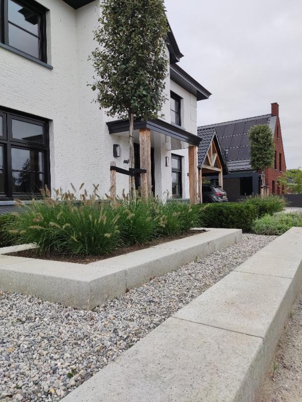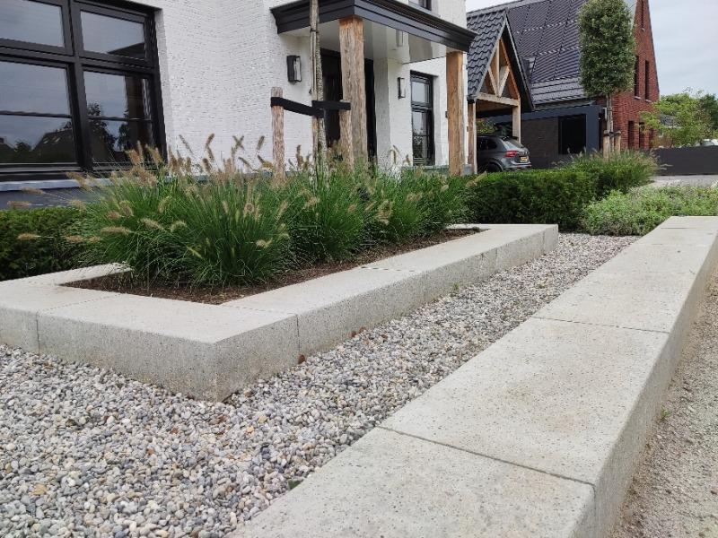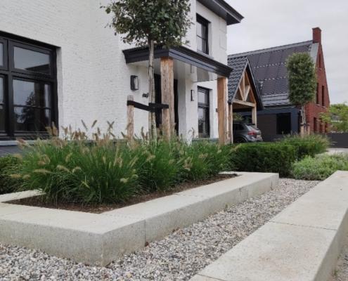 Het kunstgras zorgt natuurlijk al voor een groene uitstraling van deze tuin. Ook in de voortuin hebben we beplanting aangebracht. Hier hebben we gebruik gemaakt van Schellevis betonblokken als verhoogde border. Daarin hebben we groenblijvende steeneiken en Lampepoetser siergrassen geplant. De rest hebben we voorzien van licht blauwe morene grind. Zo vormt de voortuin een mooi geheel met de achtertuin, waar dit grind ook terugkomt en waar we grijs gebakken klinkers hebben bestraat.