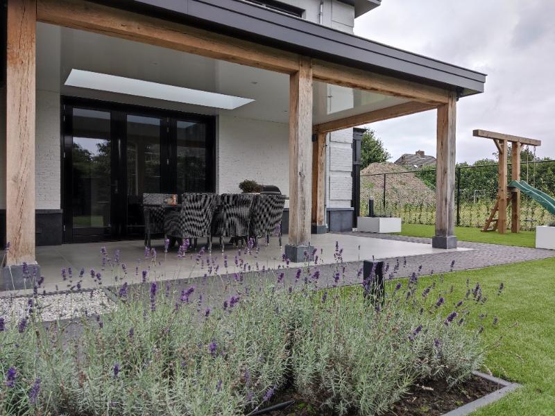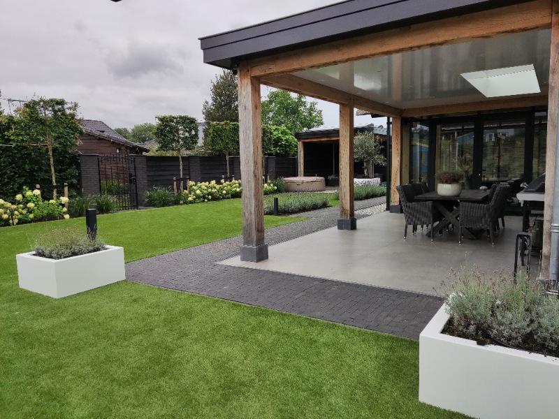 Een echte trend op dit moment zijn witte bloembakken van het merk Adezz. Deze gebruiken we vaker in onze ontwerpen als echte eyecatcher en ook bij deze tuin in Berlicum paste deze perfect in het geheel. Een strakke en moderne toevoeging. In de grote bloembak is een olijfboom geplant, dit geeft een mediterraanse sfeer aan de overkapping.