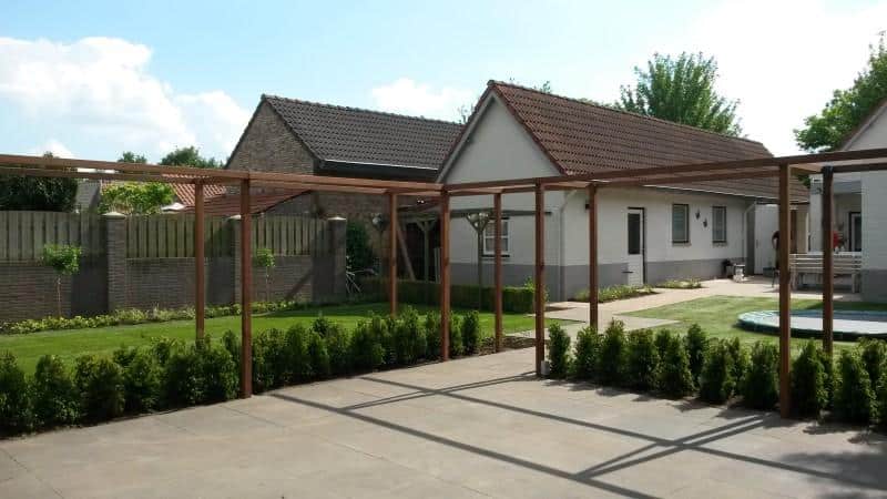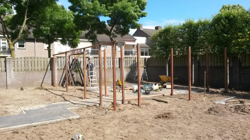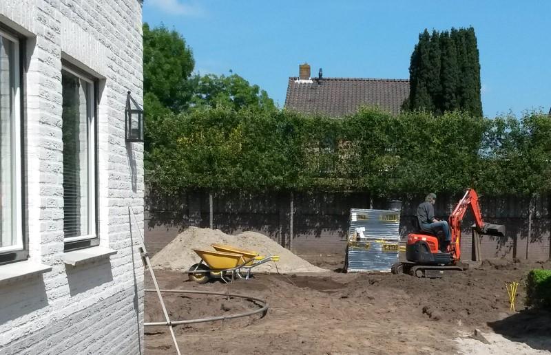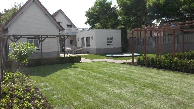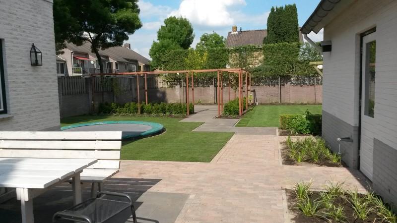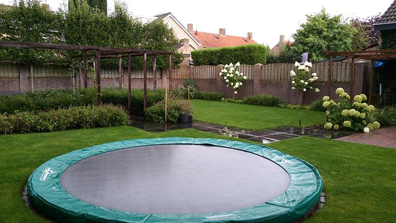 Na een goed eerste gesprek is er direct een passend tuinontwerp uitgewerkt met een combinatie van terrassen, paden en hagen, maar ook duidelijke hoogteaccenten met enkele bomen en struiken. De grote trampoline voor de kleinkinderen moest een centrale plaats krijgen, goed zichtbaar vanuit het woonhuis. De mooie lei-sierperen die al jarenlang de achtertuin sierden bleven vanzelfsprekend gehandhaafd, een betere manier om de privacy te beschermen bestaat nauwelijks.