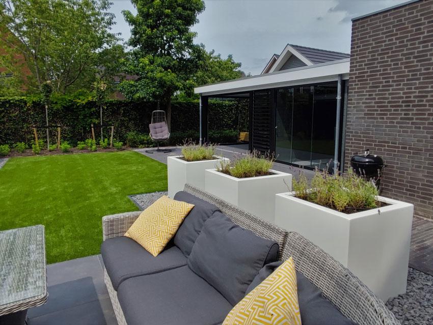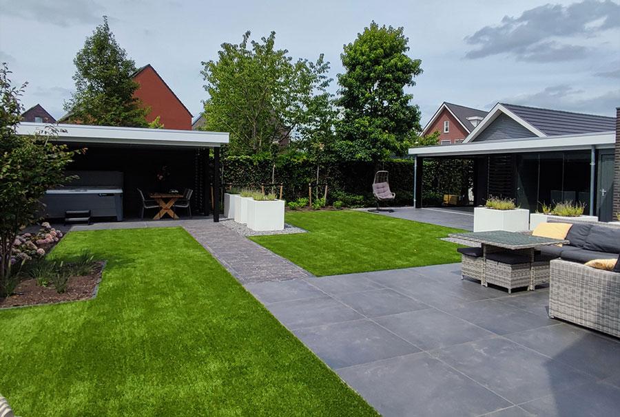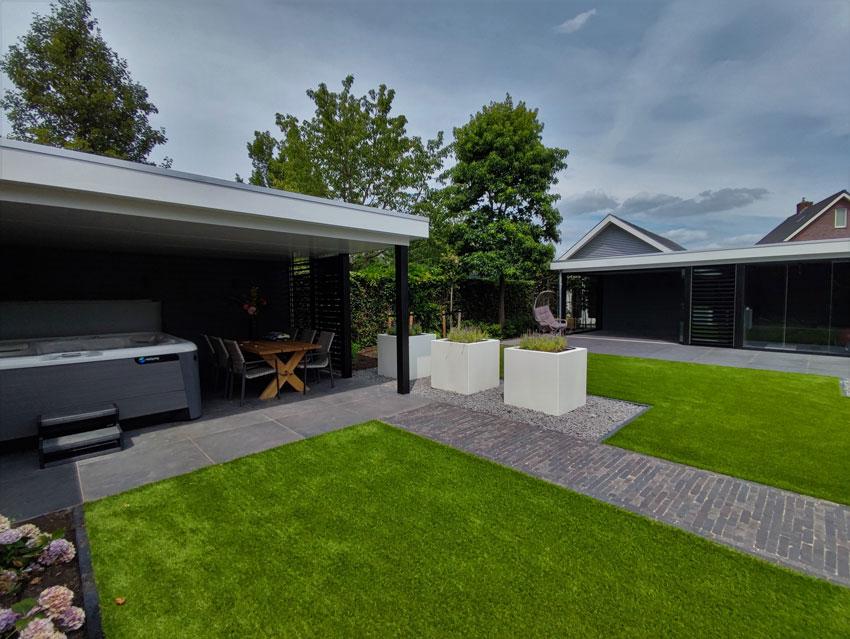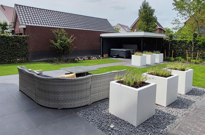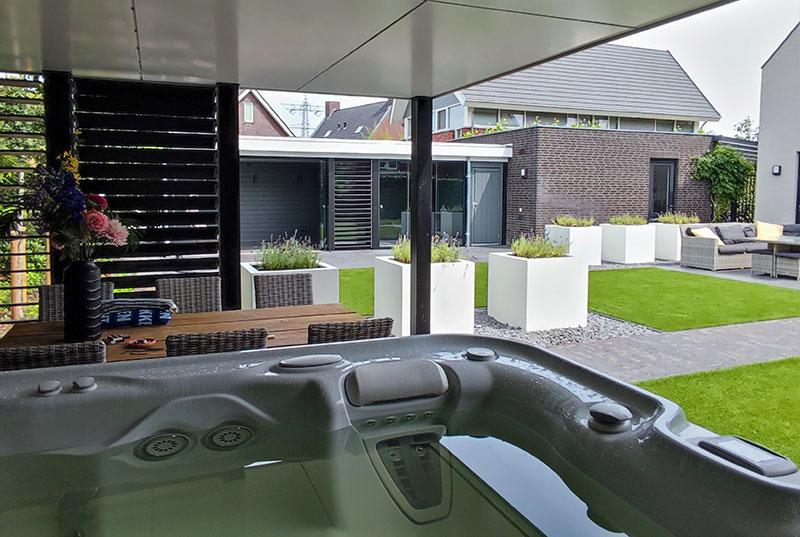 De bewoners zijn echte levensgenieters. Na een dag hard werken willen ze zich terugtrekken op een gezellig terras, met een lekker wijntje in de hand. Als het drankje op is verplaatst het stel zich van de ligbedden onder de eerste overkapping naar de moderne eettafel onder de tweede overkapping, waar het gezin kan genieten van een heerlijke maaltijd tussen de bloemenzee die het seizoen heeft voortgebracht. Terwijl de zomerzon ondergaat schiet de In-Lite automatische tuinverlichting, in deze slimme tuin, aan voor extra ambiance. De grote, witte bloempakken van het gerenommeerde merk Adezz springen op die manier goed uit. Tijd om de jacuzzi aan te zetten en de dag in stijl af te ronden. Vakantie in je eigen tuin. Iedere dag weer. Dat is wat we hebben mogen realiseren voor deze trotse tuinbezitters.