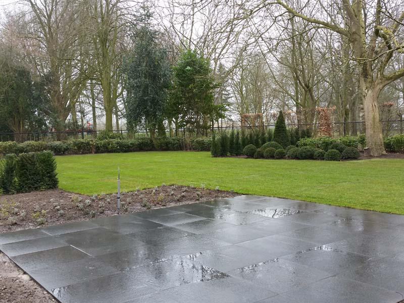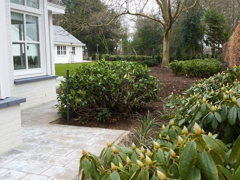Na de ingrijpende verbouwing van de villa was een forse tuinrenovatie een vanzelfsprekend vervolg. Rigoreus werd de oude beplanting gerooid en de oude bestrating geruimd om plaats te maken voor een natuurstenen bestrating, bestaande uit kasseien en graniettegels. Enkele grote volwassen bomen in de achtertuin werden gehandhaafd, waaronder een notenboom en een beuk.