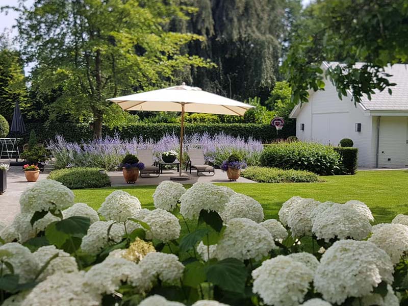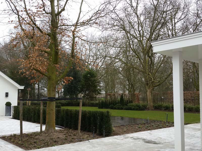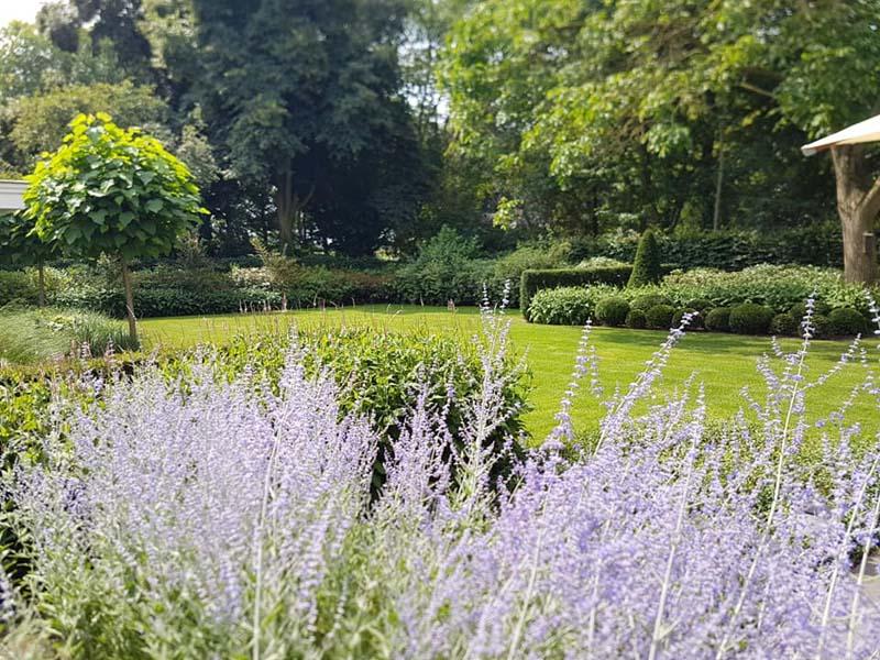 Om snel weer privacy te creëren vanaf de straat werd gekozen voor zware beuken als leibomen. De wens van de opdrachtgever was een groenblijvende structuur in de tuin te realiseren, gecombineerd met uitbundig bloeiende velden en plantenborders. Onderdeel daarvan maakte ook een lavendelveld uit, voor de sfeer en geur van hun geliefde Zuid-Frankrijk.