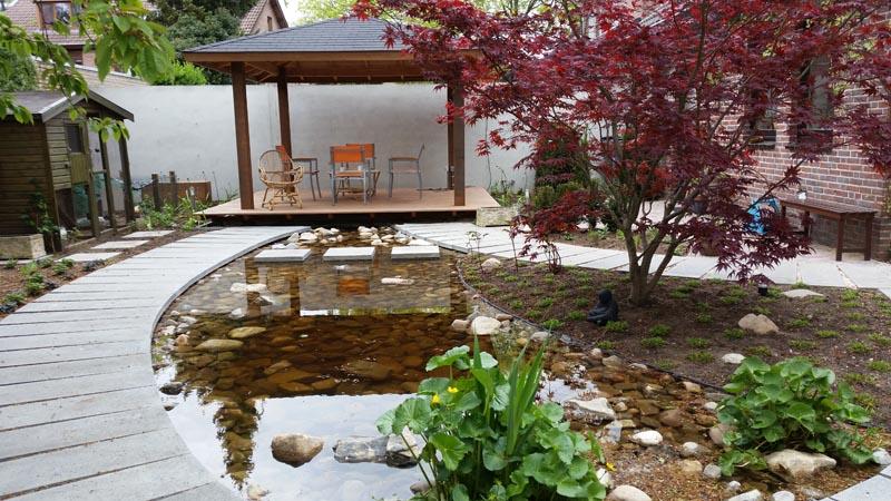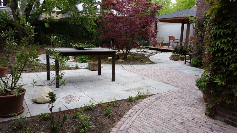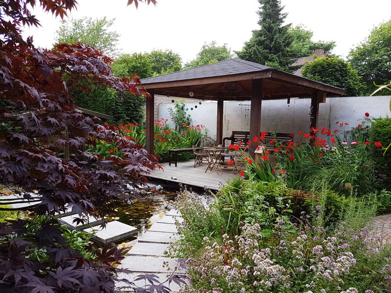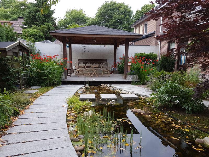 Enkele beeldbepalende elementen uit de oude tuin zijn behouden, in het bijzonder de grote felrode acer die bepalend is voor de licht Japanse sfeer in deze achtertuin. Ook de kersenboom is blijven staan, deze geeft een kleurrijke bloesem in het voorjaar en schaduw in de zomer. Als basis voor het zitgedeelte werd een zwevende vlonder aangelegd met hardhout, ‘zwevend’ boven de waterpartij en goed bereikbaar via het brede looppad dat aangelegd werd van schellevisbeton. Deze betonplaten geven het pad een robuuste, natuurlijke uitstraling, door de tijd heen wordt dit door de natuurljke effecten alleen nog maar versterkt. Tussen de Schellevisbeton is Japanse split aangebracht, dit maakt het pad rondom tot één geheel.
